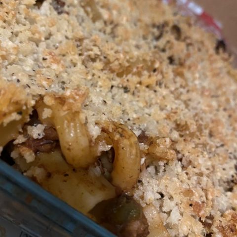 Not an actual recipe for this one… I basically just mix the Mexican Style Mince in with pasta (amount dependent on how many people the meal is for and how much mince I’m using) and then top with a mix of around 50g breadcrumbs and 50g Parmesan cheese. I just mix the cheese and breadcrumbs together with a glug of olive oil and sprinkle it over the top. Then it’s into the oven at around 200 c to cook away until either the mince is cooked through if I’m cooking that from cold or until the topping is crispy and brown if I’m using the mince straight from the hob.