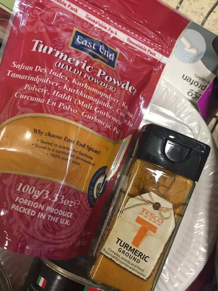I picked up a small jar of Turmeric a while ago in the spice aisle at our local Tesco – 85p for 45g I think it was. I carried on wandering with my shopping list and stopped at the ethnic food section to pick up some coconut milk and I managed to pick up a packet for 100g for just 99p which is double the amount for an extra 14p.