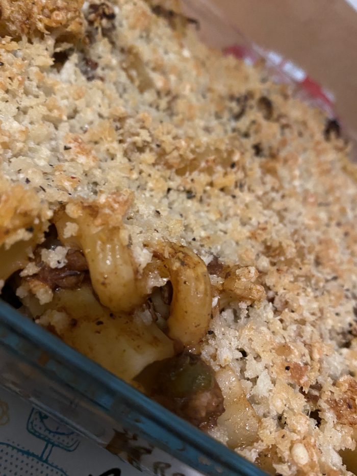 Not an actual recipe for this one… I basically just mix the Mexican Style Mince in with pasta (amount dependent on how many people the meal is for and how much mince I’m using) and then top with a mix of around 50g breadcrumbs and 50g Parmesan cheese. I just mix the cheese and breadcrumbs together with a glug of olive oil and sprinkle it over the top. Then it’s into the oven at around 200 c to cook away until either the mince is cooked through if I’m cooking that from cold or until the topping is crispy and brown if I’m using the mince straight from the hob.