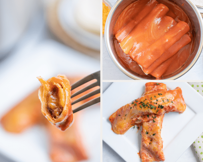 - Cut into pieces and serve, or using tongs, remove enchiladas individually and scoop sauce from the bottom of the dish.