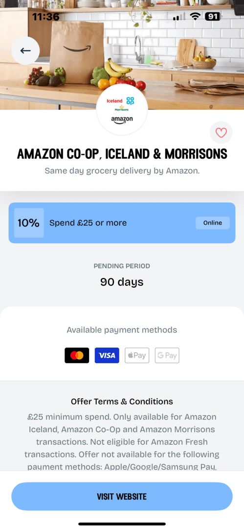 They also have 10% cashback on Amazon Grocery with a minimum spend of £25 but looks like it’s only on Iceland, Morrisons and Co-op Amazon deliveries.