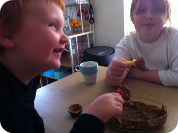 Add two children and allow them to dip the chopped fruit into the melted chocolate