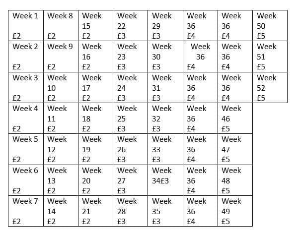 I’ve made a little table that you can print off and stick to the front of whatever you’re going to be using to save up in, it tells you how much you need to save each week so you can tick it off as you go along.