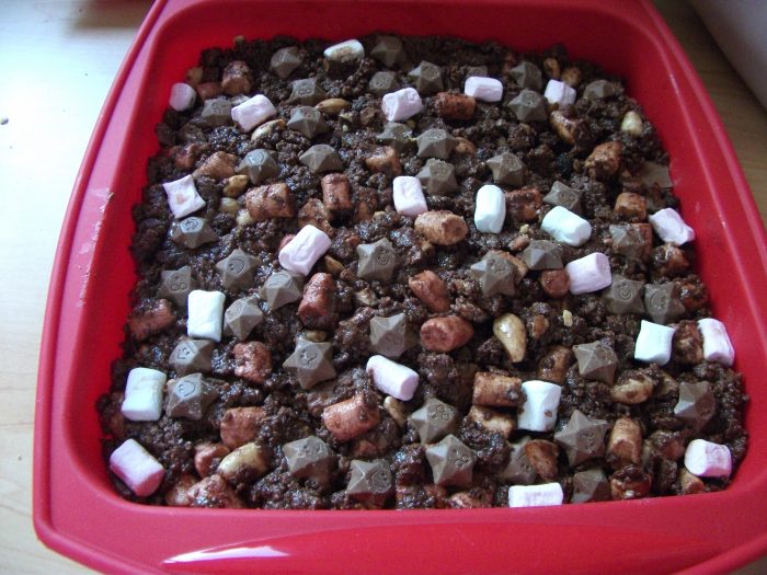 Press it firmly into a baking tray and top with the rest of the marshmallows and some magic stars. Then you just need to pop it in the fridge to set.