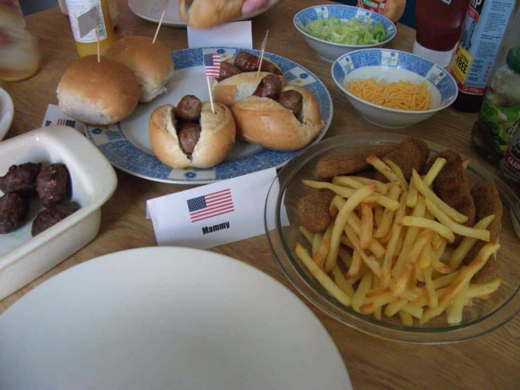 We had an American themed tea as well with mini hot dog buns, home made burgers, american fries, coleslaw, potato salad, chicken goujons, mini corn on the cobs and a salad. All served on a very American table with little name plates and mini flags on cocktail sticks!