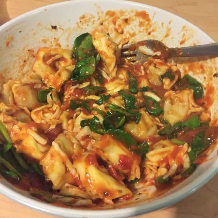 You might have noticed a pattern with this week’s meals so far – they’ve all been cooked by someone other than me as I’m having a super busy week! Tonight is a concoction made by Mr Frugal and added to by Miss Frugal – tortellini (shop bought) and some homemade tomato sauce heated up with some chilli powder, some spinach and some grated cheese.