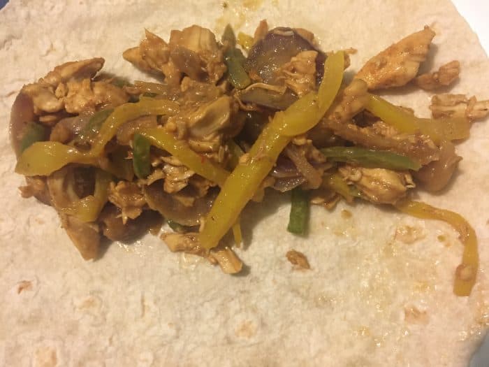 We made some really quick and easy fajitas for tea tonight with some sliced yellow and green peppers and red onion gently fried in a little olive oil with two chicken breasts that I remembered to get out of the freezer last night. The chicken breasts are the ones I get from Muscle Foods and they’re huge so two is enough for us all easily when it’s mixed with the veggies. I use a sachet of fajita mix for the flavouring and sometimes I make homemade flatbreads but today I used some Tesco own brand wraps which cost 90p. We also had some homemade Slimming World style chips to go with these.