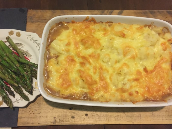 Today we had an amazing cottage pie which was so easy to make! The mince needed using today and I remembered with about two minutes to spare before I needed to leave for work this morning – I honestly threw the mince in the slow cooker with some stock cubes and water and left it all day to cook until I got home from work. It took no time at all to top the mince with some mash (made by Mr Frugal) and some cheese and it took about twenty-five minutes to cook in the oven. The asparagus cost 15p as it was reduced last night when I went to the shop. We also had broccoli and cauliflower too.