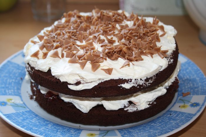 I won’t give you the detailed recipe because it’s really just a chocolate Victoria sponge cake but just in case you want to know – All you do is cream 150g of sugar with 150g butter. Add three eggs, 125g self raising flour and 25g cocoa.