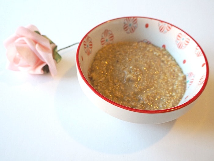 - Stir in your oatmeal adding a little at at a time until you have a consistency that is runny enough to spread on your face but thick enough that it will stay put.