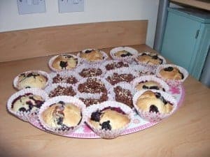 We managed to buy some bargain blueberries from the shop tonight – a big punnet reduced to 65p. I was planning to use them to make something exotic and different but in the end we just made plain old boring muffins!