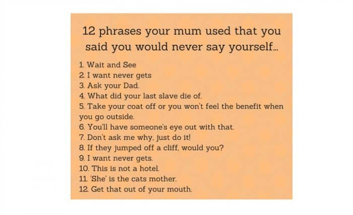 I remember being a little baffled (love that word) by some of the things my Mum would say to me when I was a child.The younger version of me used to wonder what jumping off cliffs had to do with going with my friends to the shop when I was supposed to be playing in the street and what was this benefit that I would feel when I went back outside? And as for our house not being a hotel, well I knew that already because if it was then I wouldn't have had to make my own bed every morning would I?So the younger version of me promised herself that she would never use these silly phrases when … [Read more...]