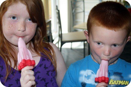 We were given the fab rocket ice lolly moulds when we went to see Glee a few weeks ago but I’ve seen quite cheap ice lolly moulds from the big 3 supermarkets so I’m pretty sure you can get them in most supermarkets. In the past, we’ve also used empty yoghurt puts and silicone moulds with lolly sticks stuck in them before you freeze them.