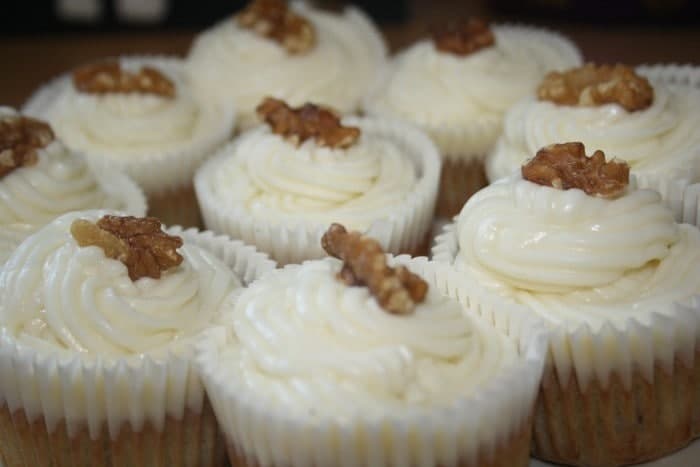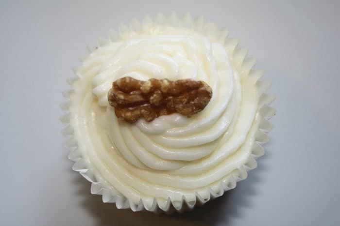 I’ve written here about what I think is the best way to ice cupcakes but to be honest with these you could just spread the icing on the top of each cake and top with a piece of chopped walnut.