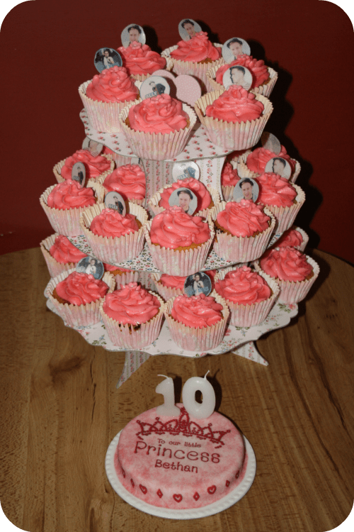 The cakes were made in the same way as the ones I wrote about last week except these ones have little Olly Murs edible paper circles stuck in them (just bought off eBay – search for edible paper cupcake toppers). They’re arranged on a really pretty reusable card cupcake stand which cost me less than £4.00 (again you can buy from eBay easily enough).