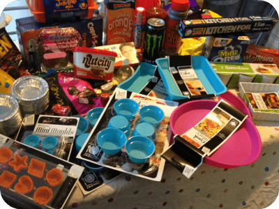 I took Miss Frugal along and we had a great time filling our baskets with their range of silicone cake cases, ceramic ramekin dishes and flan dishes, colourful whisks, foil cake cases (great for Christmas) and a set of kitchen scales. Â I even bought some cute little moulds to make sweets in for Christmas presents and a giant airtight container to store our finished cupcakes in. Â Then we moved on to the foodie aisles and stocked up on some ingredients – eggs, icing sugar, sprinkles, coconut milk, (no idea but I have some sort of bounty cupcake in mind for some point in the future), chocolate spread that looks and smells a lot like Nutella but is half the price for a bigger tub and lots more as you’ll see from the photo below. Â And we still had vouchers left over to buy some sweets, drinks and a couple of toys each for the kids.