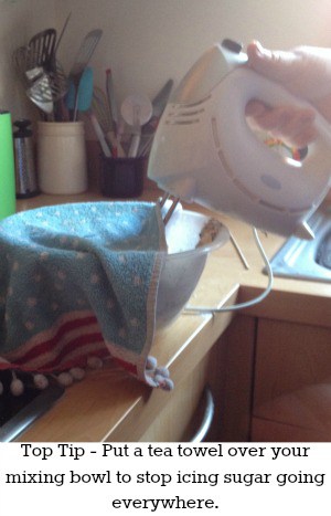 Add all of the ingredients to a mixing bowl and using an electric whisker combine them until your mixture is smooth and creamy. Miss Frugal was decorating ours so I went for the easy option and made ours a little bit softer so she could just spoon the frosting on to the top of the cakes. You could add more icing sugar to make a stiffer mixture if yo were planning on piping it on to the cakes.