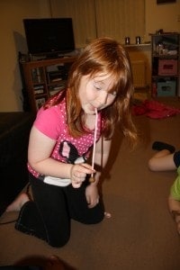 One contestant lies on the floor with their mouth open and the other has to use their straw as a snooker queue to get the Malteser into their mouth. It’s best when Miss Frugal’s mouth is the hole as it’s so big you can’t miss it 😉
