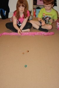 Gently throw a marble or something similar into the middle of the floor and then everyone has to throw their Malteser as close to the marble as possible. We did use a Malteser instead of a marble at first but there was a bit of confusion as to which was the marble Malteser and which was the Malteser Malteser if you know what I mean.