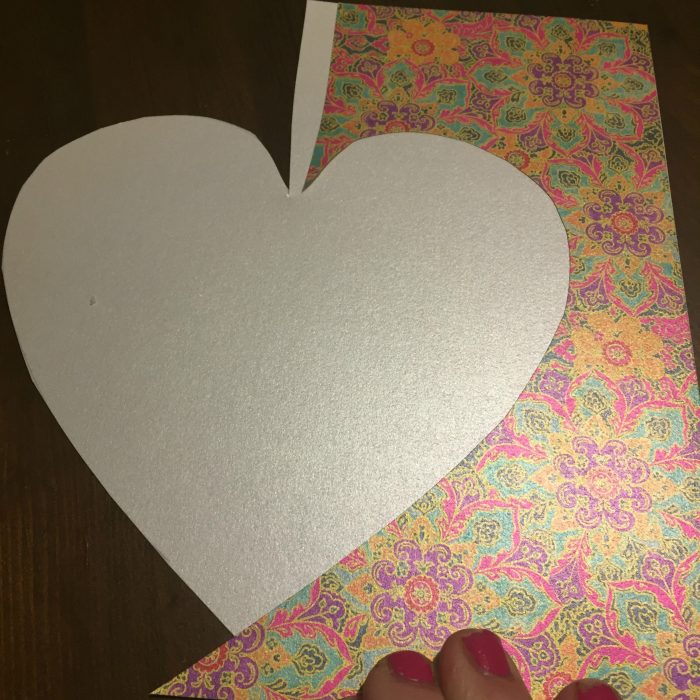 First of all you need to cut a heart out of a piece of pretty paper or card. I always find it dificult to draw a symettrical heart and I don’t have anything to use as a template that’s the right size so I draw one half and cut it out as neat as I can and I then turn the off cut or card over and use that as my template for the other side! You could of course just fold your heart in half but the fold lines, however light they are, would take away from the finished look of the envelope.