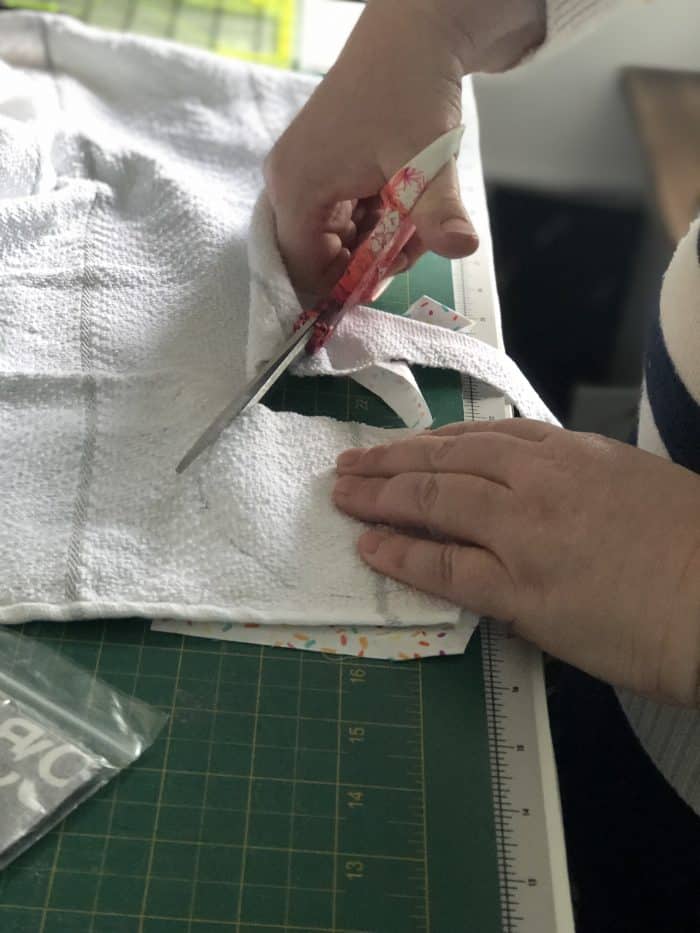 - Take 1 circle of tea towel fabric and one circle of cotton.