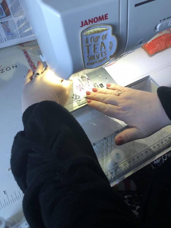 So, we used a small cup as a template for the circle and cut out what feels like a million circles out of the cotton fabric and an equal amount of circles out of the tea towel. To be fair, poor Jen got to do most of the cutting while I tried to master the sewing machine.