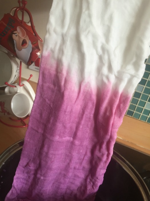 - Let the material and liquid simmer away on a low heat for an hour or so remembering to give it a quick stir every now and again to make sure the fabric dyes evenly.