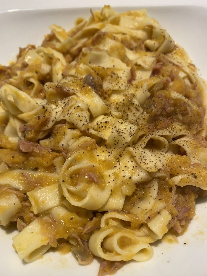 I should say before I start though that a true traditional Italian carbonara has just five ingredients – pasta, eggs, hard cheese, cured pork, and black pepper so this is my version of the dish which I originally made kind of by accident as I was making some of my spicy butternut squash and sweet potato soup but I made it too thick so decided to try and use it as a pasta sauce as I’d read a few times that Butternut Squash made a good carbonara-style sauce.