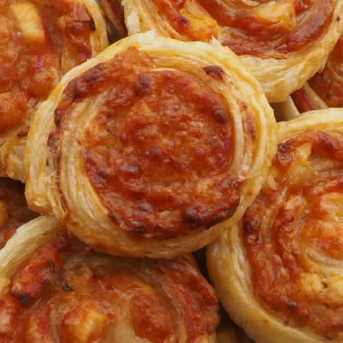 Unroll the pastry and spread with the tomato sauce. You only need a very thin layer as you don’t want your swirls to be too soggy.