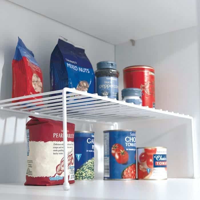 My food cupboard has a mini shelving unit like this one at the back of it so I can double layer my tins. Obviously this is not a picture of my food cupboards – you can’t see the back of my food cupboard at the moment so no point taking a photo to show you the shelves at the back!