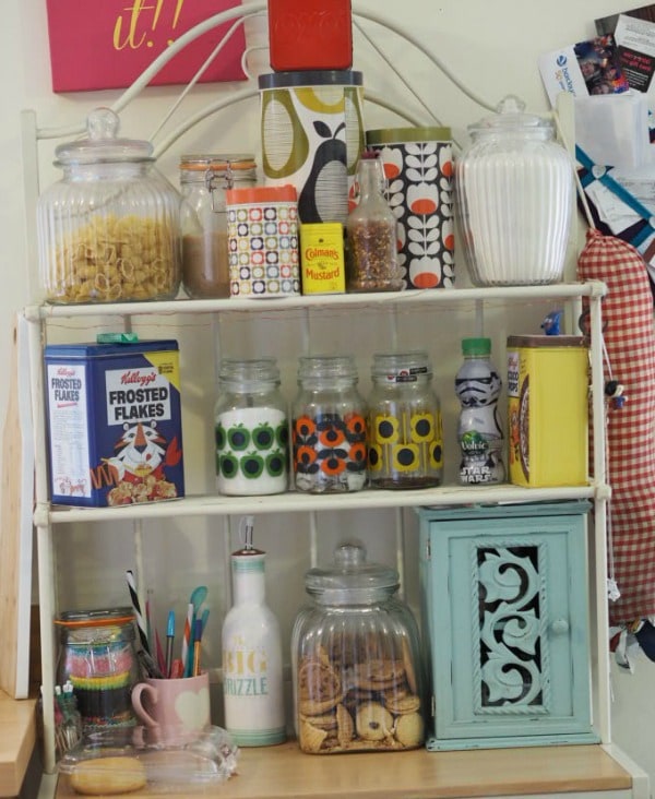 I have a really cute wire shelving unit in the kitchen and it’s filled with vintage tins and pretty glass jars. On here I store things that would have taken up space in the cupboard at one point so it’s saving space as well as looking pretty.
