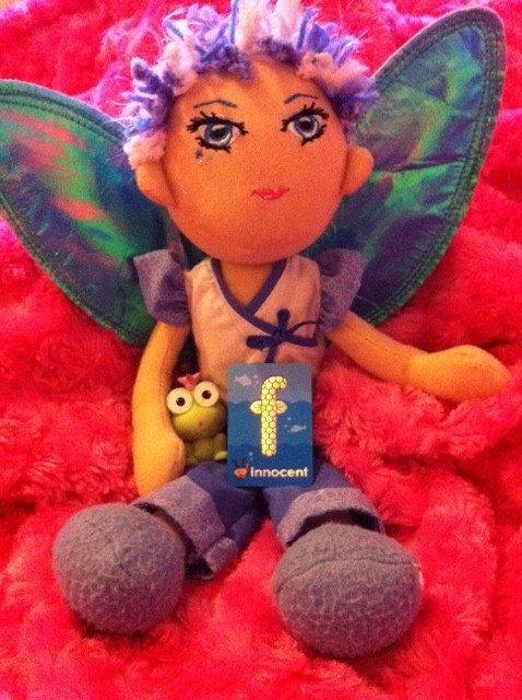 It’s Florence the Funky Fairy sat on a Fuschia Fur Blanket with her Friend, Freddie the Frog.