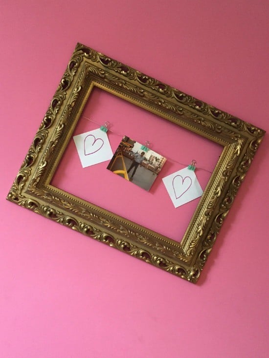 This is a piece of wire stretched across the middle of a beautiful photo frame so Miss Frugal can hang her favourite pictures using pretty coloured bulldog clips.