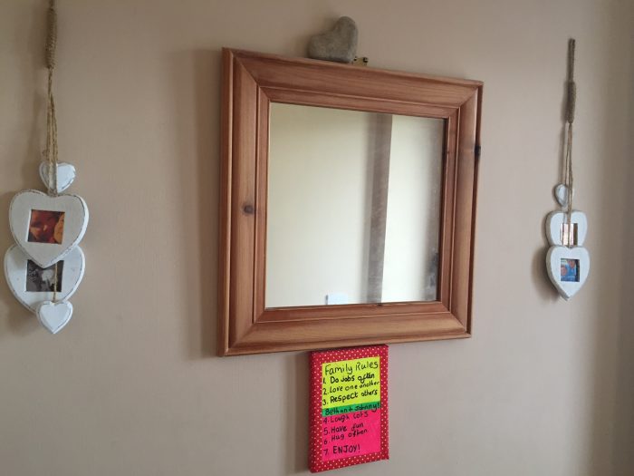 This mirror was a 50p bargain a few years ago – probably because it was so ugly with a shiny orangey coloured varnish on it. A quick sand and it looks beautiful hanging in my hall, although it definitely looks like it needs a clean in the picture!