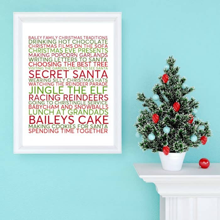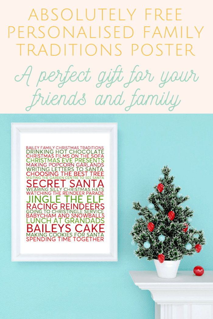 My Family Christmas Traditions poster would be a great present for someone and you could frame it in a cheap frame from the pound shop as they have some lovely ornate ones in there at the moment and you’ll have a gorgeous personalised Family Christmas Traditions poster to give as a gift. You could even be a bit clever and print it off smaller and make it your family Christmas card this year.