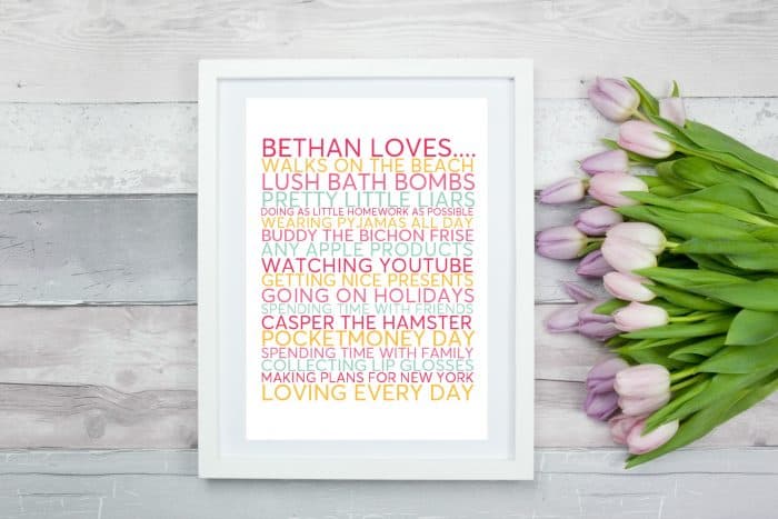 This FREE personalised poster maker is going to help you make the perfect homemade gifts for your loved ones! Your options are unlimited – make a poster filled with personalised family Christmas traditions, a personalised likes poster, a poster filled with all your special memories with a loved one or even a wish list or a bucket list. All you need to do to make your own is choose from our range of colours and type in what you want your poster to say!