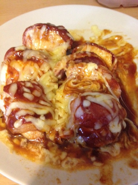 Then top it with some Barbecue sauce and some grated cheese. I used some reduced price Barbecue sauce that I bought for 23p but you could just as easily use any Barbecue sauce (the Heinz one is nice).
