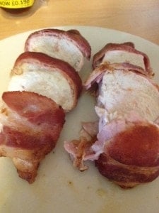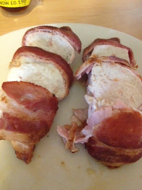 All you do is wrap a chicken breast in a slice of bacon and bake it in the oven until the chicken is cooked through.