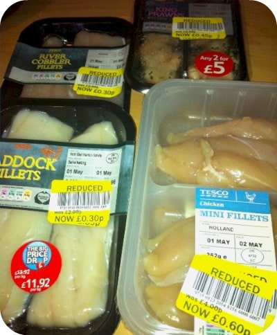 In one shopping trip, I got two packs of chicken fillets for 60p each, 2 haddock fillets for 30p, 2 river cobbler fillets for 30p and some king prawns for 45p – Bargain!