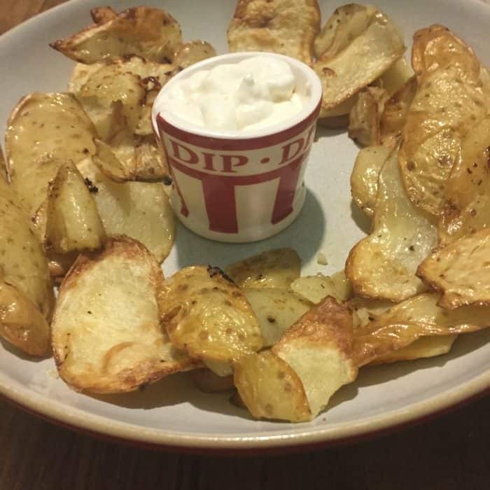 I was planning to do mashed potato for our main course so I used a sharp knife to peel the potatoes which meant I got a little more potato on the peeling if that makes sense. 😉 I then just tossed the potato peelings in a little olive oil, seasoned with some salt and pepper and then cooked them in the airfryer until they were starting to crisp up a little bit.