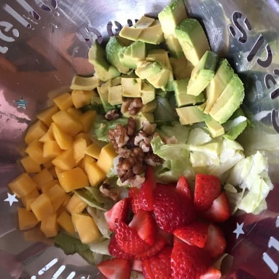 Lately we’ve been enjoying salads with our meals but we get a bit bored of plain old lettuce, tomato and cucumber so we’ve been experimenting a little bit – not all of our combinations have worked but at least we’re trying – I prefer to make the salad tasty enough that little or no dressing is needed so I try to add as much flavour as possible. 😉 When I’m serving salad to go with a meal I do bulk it out often with things like feta cheese, hard boiled eggs, boiled potatoes or even mushrooms so it’s a bit more substantial.
