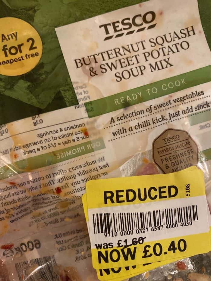 I always check the reduced fruit and veg section for ready-made soup mixes because there’s often a couple of packs of yellow stickered soup mixes which work out to be fantastic value for money. This little pack cost me 40p and took me 2o minutes to make three big portions of delicious soup in my soupmaker.