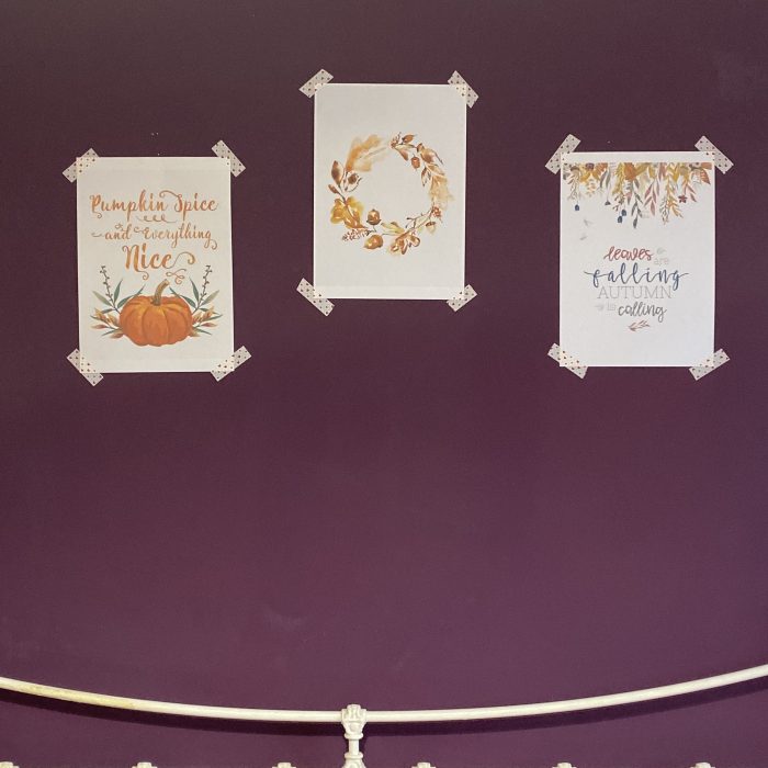Something needed to happen to cover up the ugly marks but knowing that I want to paint the room, I didn’t want to buy anything because I don’t know what will fit when I get around to painting (currently scheduled in for the end of this month when I have a week off) so instead, I turned to Pinterest. I searched for ‘free Autumn printables’ and found three pretty prints that I printed off and stuck up with some washi tape.