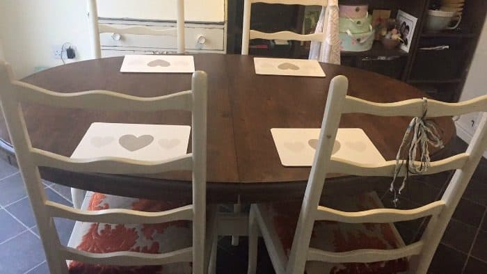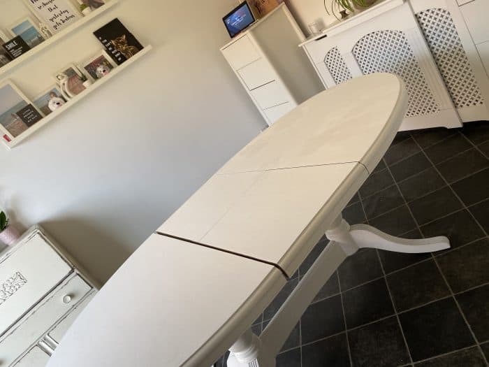 My dining room table is definitely looking a bit worse for wear which isn’t surprising when I realise how long we’ve had it – this is the photo of it when I shared it in a ‘five frugal things’ post back in 2016. I bought it from a friend who was selling it for £40 and then managed to sell my old table for £30 so this one cost me just £10 really.
