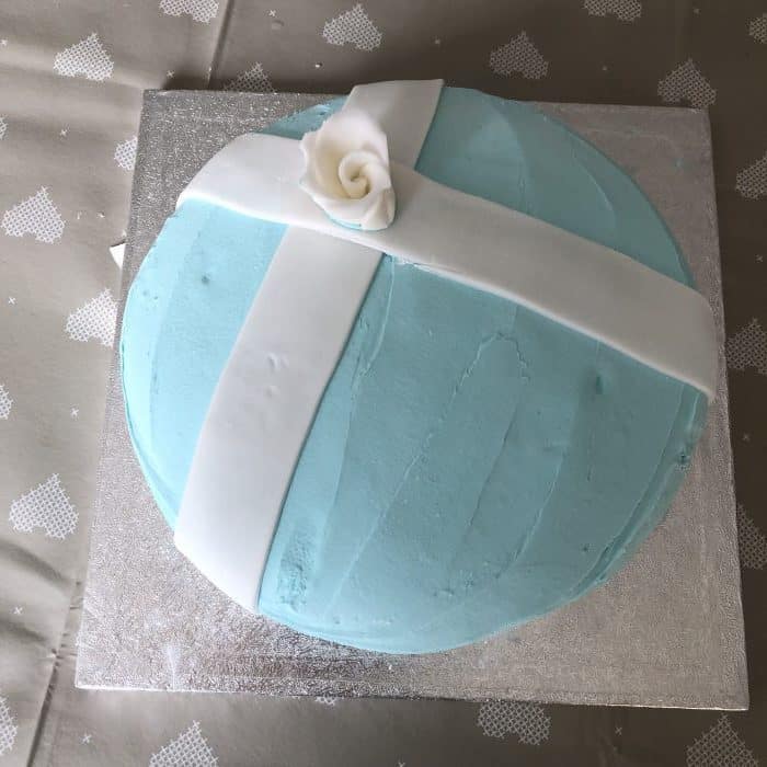 I just wanted a simple cake that looked like a Tiffany gift box so I decided to make my own but I was really short of time myself after the week we’d had so I cheated and bought a ready iced plain Madeira Birthday cake, some Royal Icing and some turquoise food colouring. I coloured most of the royal icing with the turquoise, adding just enough until I made a Tiffany Blue colour and I just added a thin layer of that over the icing that was already on the cake. I then rolled out some white icing and made a ribbon which I laid over the top, hoping to create a gift box kind of effect and added the rose that had been on the cake when I bought it after several failed attempts at a bow.