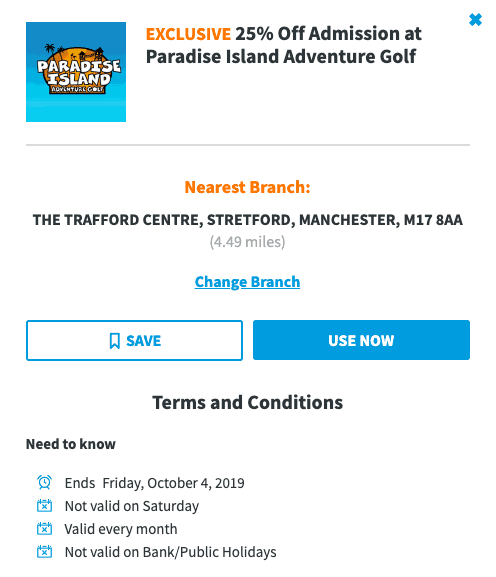 5) You’re probably going to laugh at me for this one but for the last couple of years, I’ve really wanted to learn to play golf. I’ve even gone as far as to learn some techniques using the information on this golf website and my neighbour’s golf clubs but I’ve never braved an actual golf course yet. The closest I’ve got to actually playing golf is every year when we go to Manchester as we always go and play Mini Golf indoors at the Trafford Centre but it’s not the cheapest thing in the world to do! I found a 25% discount code which I had hoped to use it off the family price of £26 making it £19.50 which, although still not cheap, it’s at least cheaper than full price.