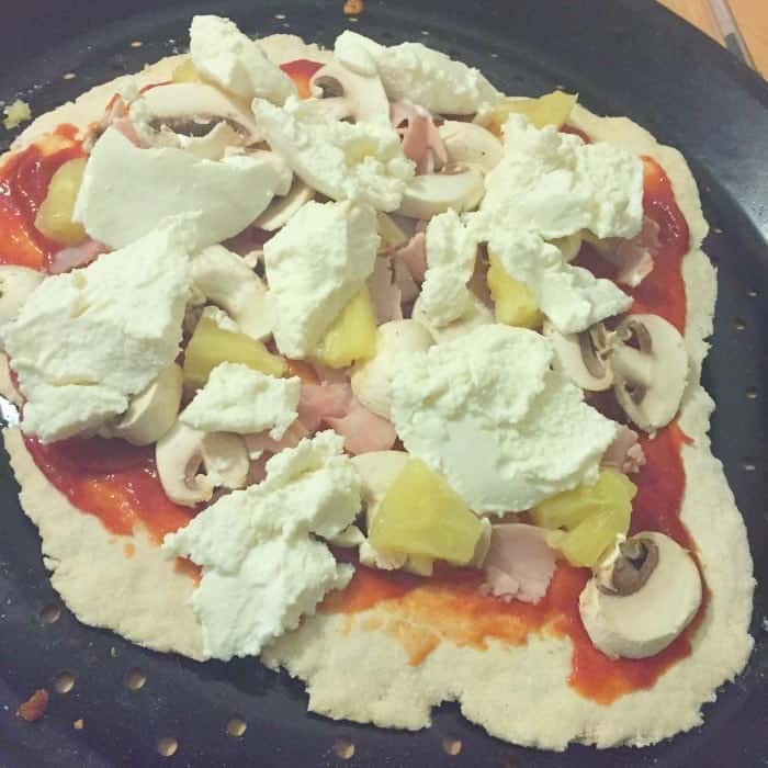 4) Last night we had friends around for tea so I decided to make homemade pizza and use up everything I could from the fridge – the pizza dough cost pennies and the toppings were all from the fridge and the cupboard apart from the ricotta cheese that I used which was reduced to 37p. We had sliced mushrooms, gammon leftovers, a tin of pineapple and they were delicious! I’ll share my recipe in the next few days but here’s a sneak peak of it before it went in the oven: