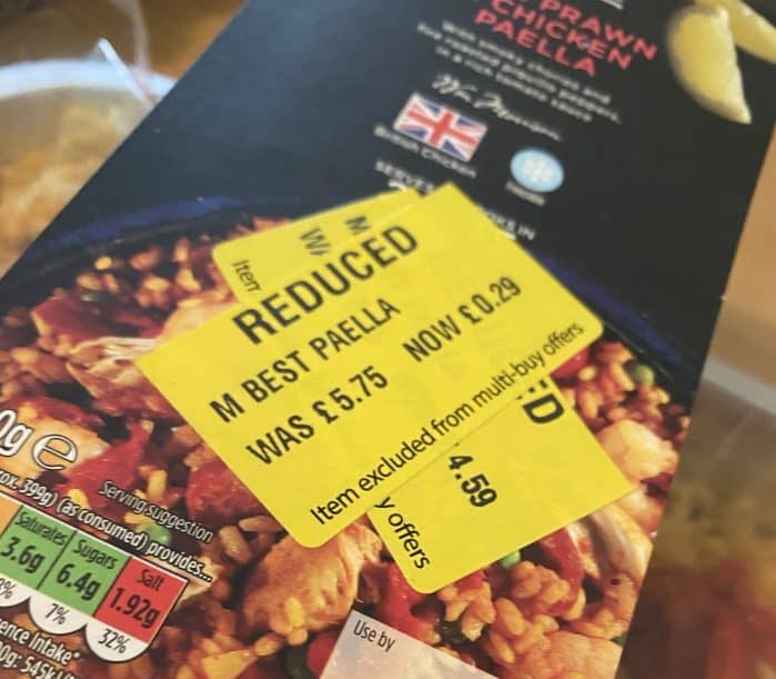 I managed to get two of these paellas reduced from £5.75 each to 29p which was fantastic – especially as it was from their finest range and tasted amazing!