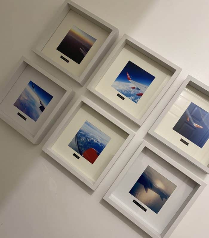 I love a good wing shot when we go on holiday so a few years ago, I printed out the photos from my favourite holidays and framed them. I used a label maker to label each picture with the destination and then hung them all together.