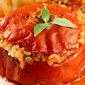 I love stuffed tomatoes and I’m sure you could do this just as easily with a pepper but I’m not a fan of peppers so I’ve never tried it like that myself. I usually just stuff a giant hollowed out beef tomato with as much paella / risotto as I can fit in there and bake it for half an hour at around 200 c.